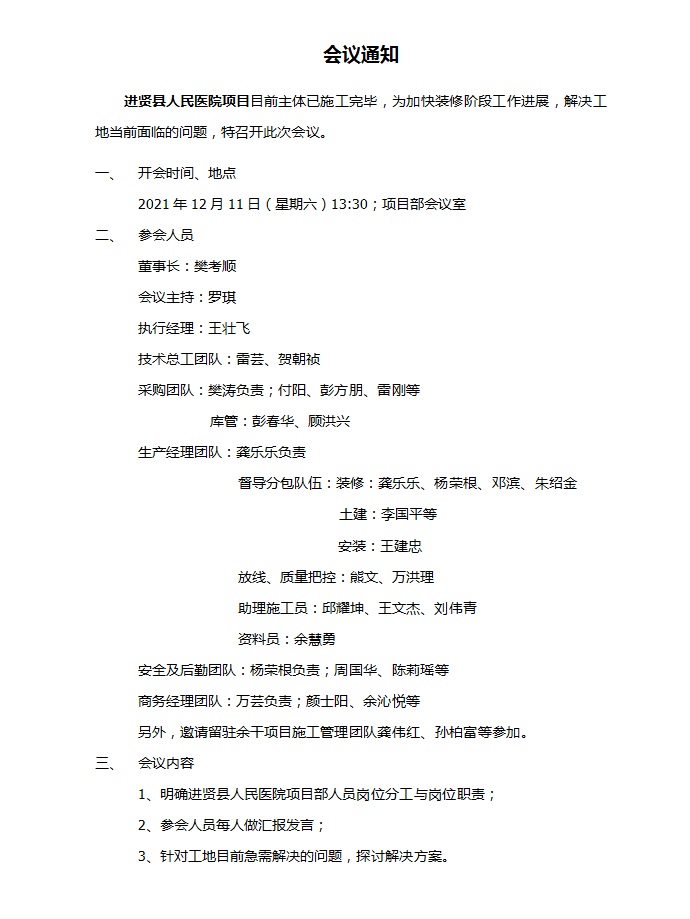 针对工地当前面临的一些主要问题和挑战,樊总特别安排召开了专题会议,对进贤人民医院整体搬迁工程项目部的组织机构进行了调整,进一步明确了管理人员岗位分工,以从容应对各种复杂的问题和困难。